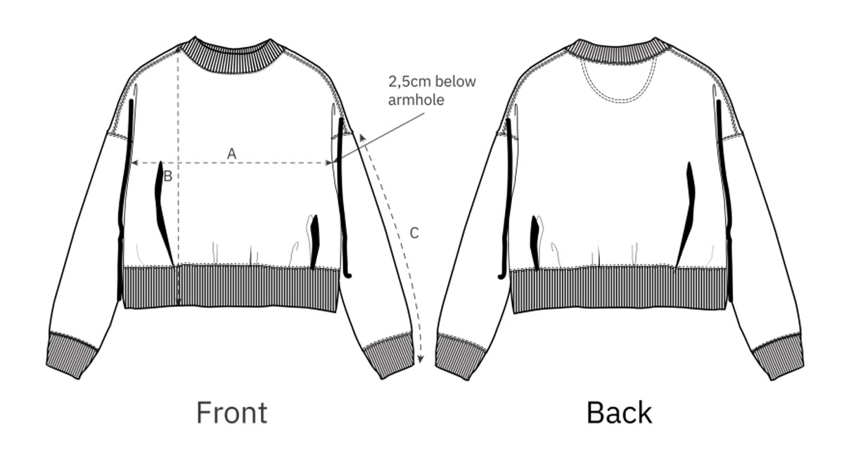 • 1x1-Rippstrick an Ärmelbündchen und unterem Saum